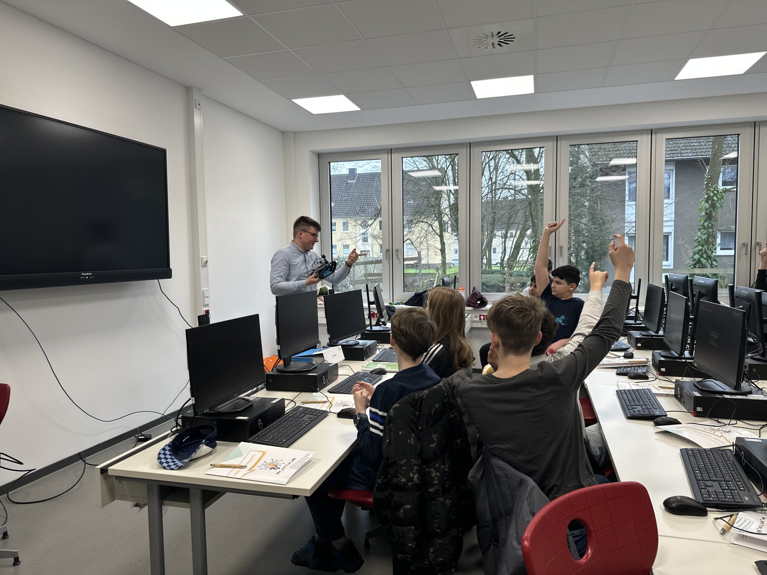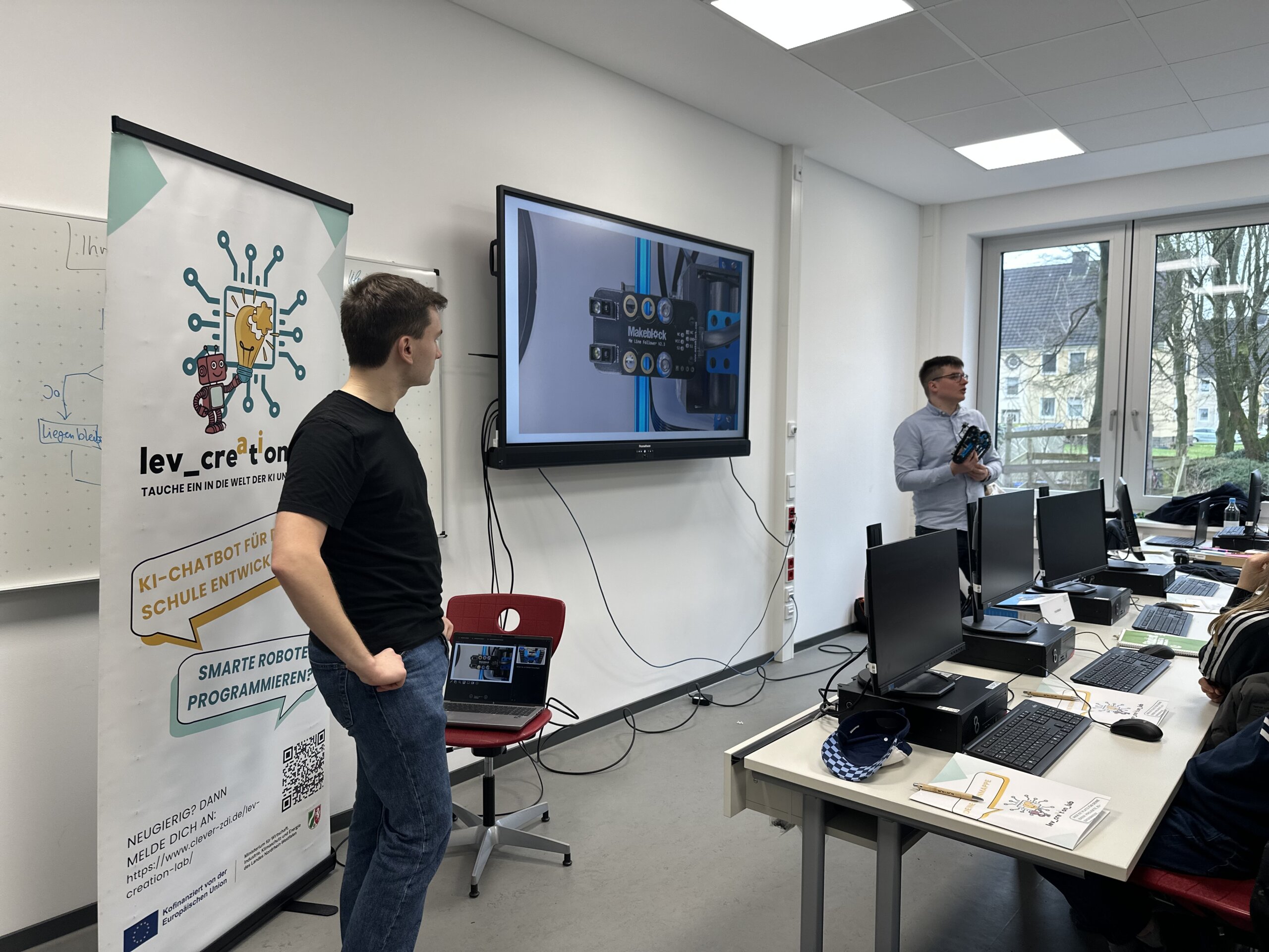 Zum Start der autonomen Robotik-AG am Lise-Meitner-Gymnasium durften die Jugendlichen bereits den Roboter kennenlernen, welchen Sie in der AG mit den Experten von AGU in Leverkusen programmieren.