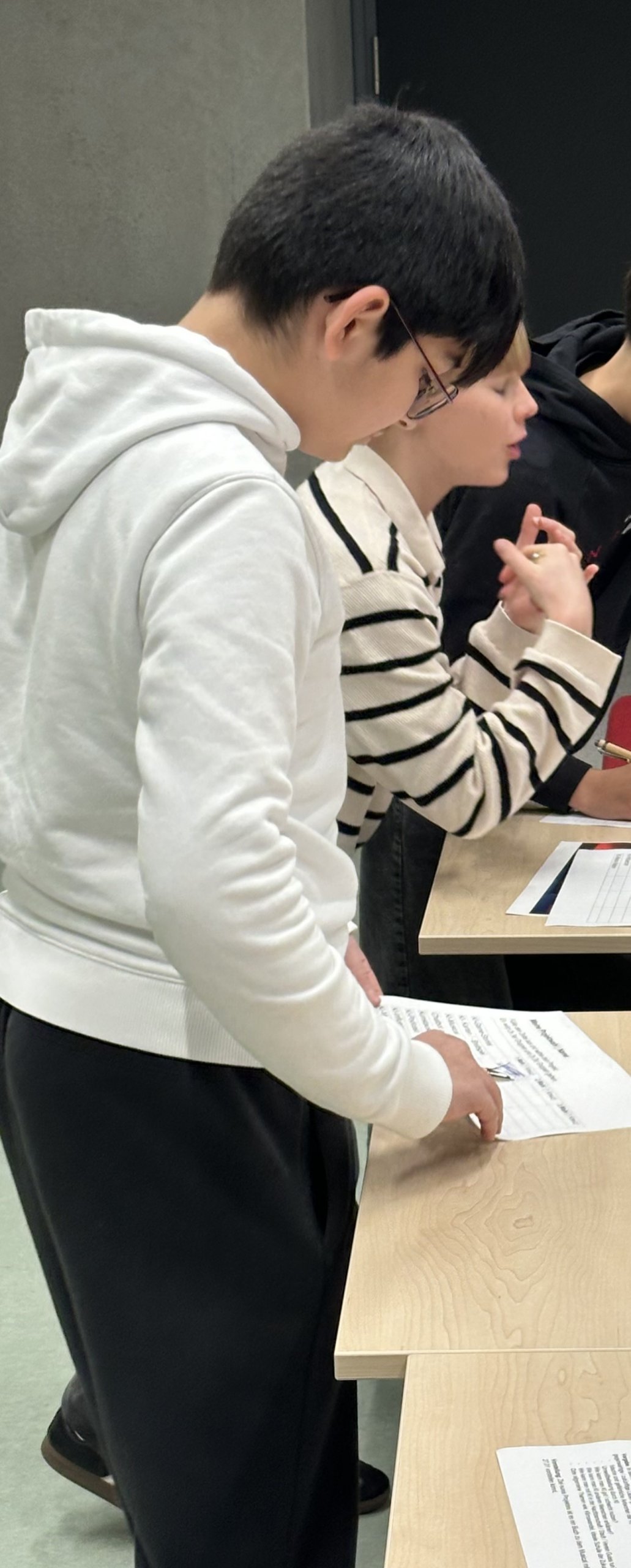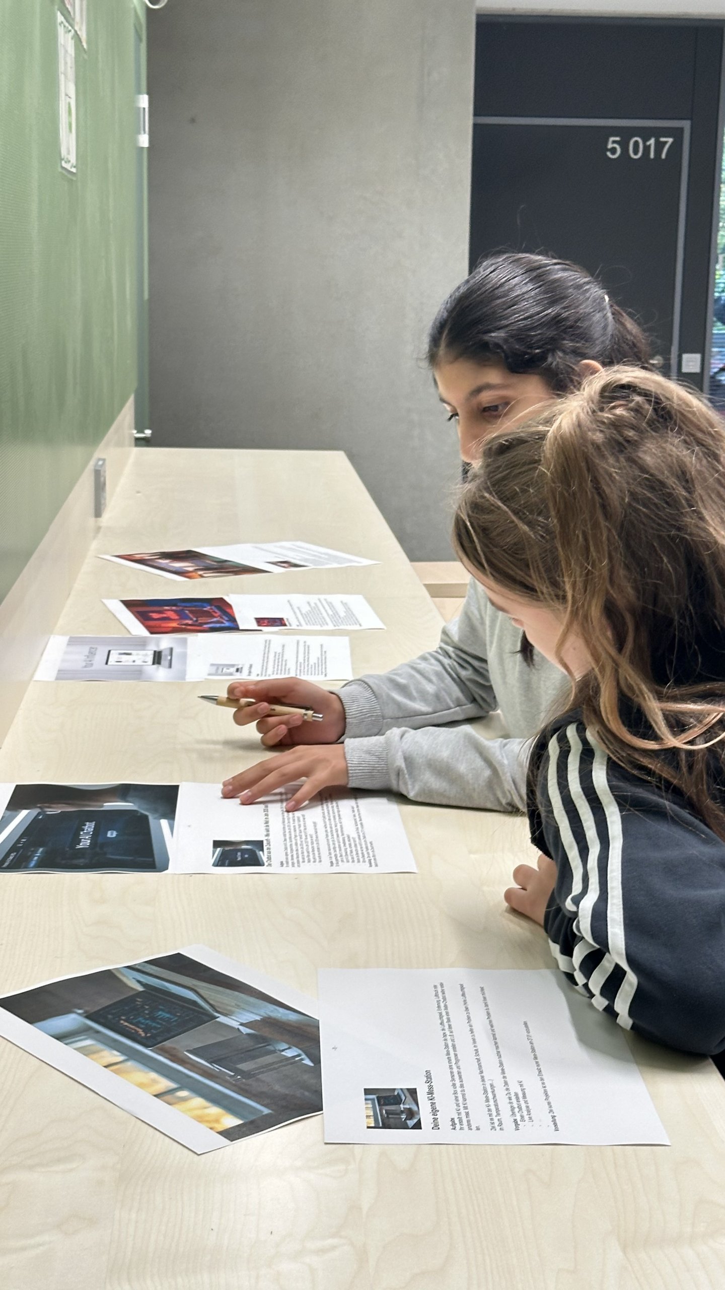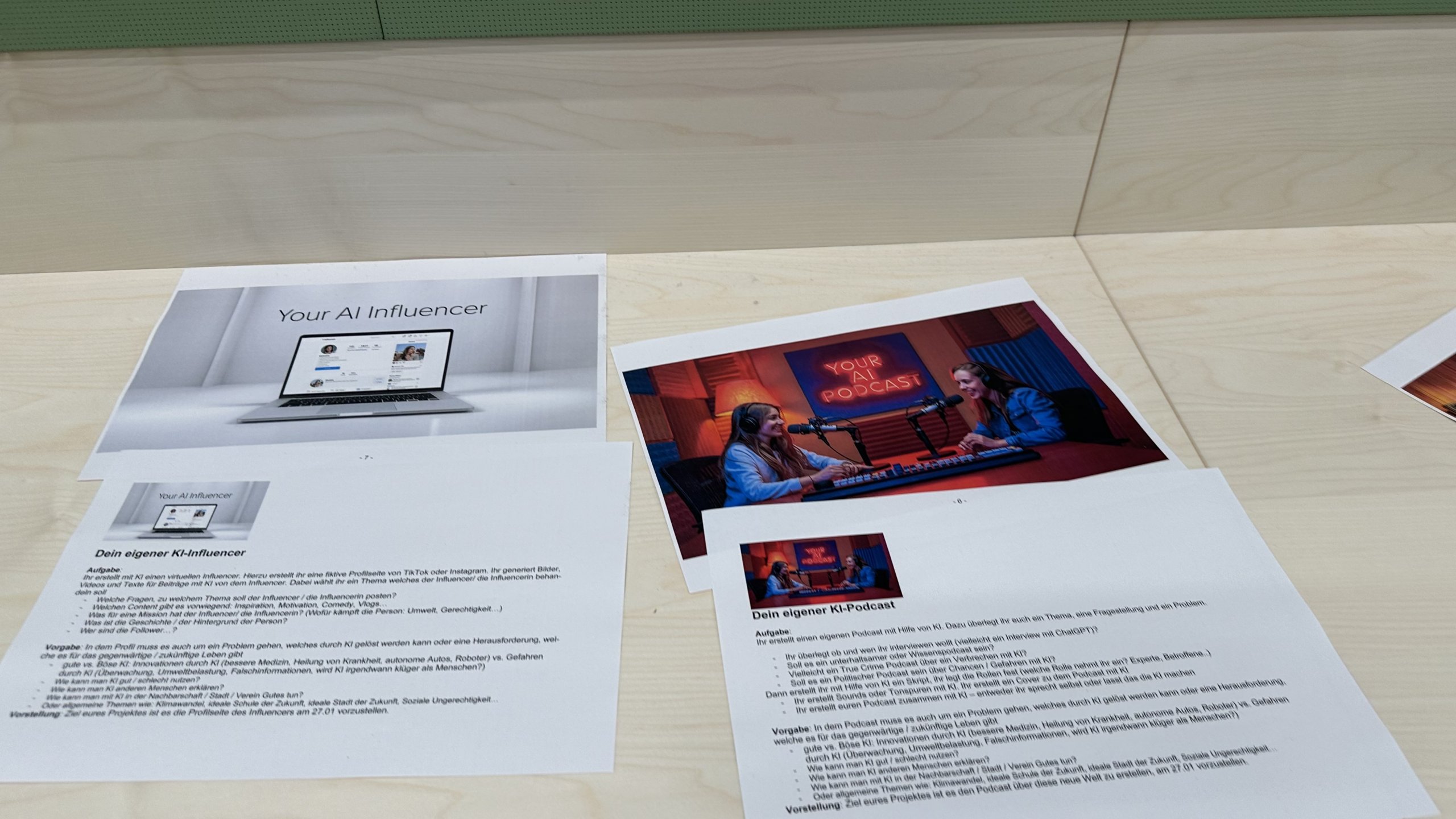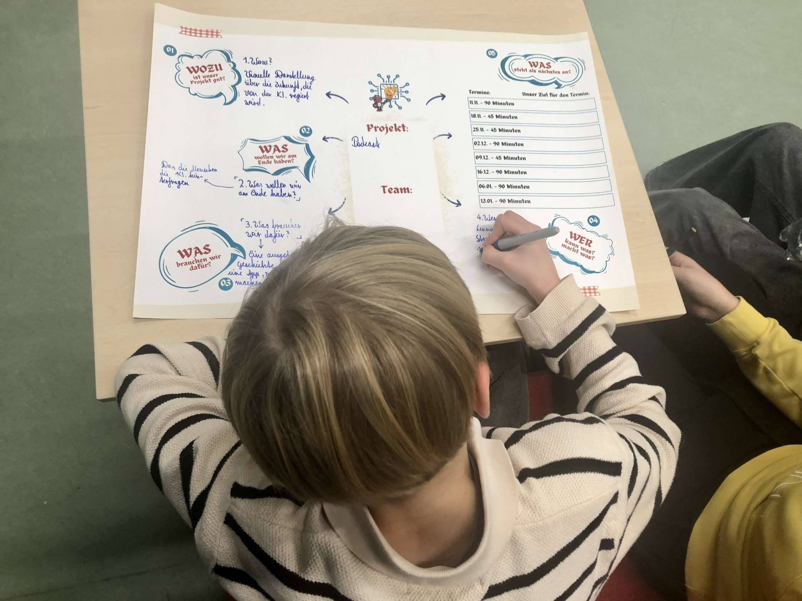 Aus einer Menge an möglichen Projekten konnten sich die Teilnehmenden zusammen mit anderen aus der AG ihr eigenes Projekt aussuchen. Ob ein kleines Musical mit KI, eine KI-Messtation, ein KI-Podcast oder ein „Storybook“ für ein eigenes Spiel mit Hilfe von KI: Die Auswahl wurde den Teilnehmenden nicht leicht gemacht. Doch nach der ersten Stunde nach den Herbstferien haben sich die Projektgruppen um ein bestimmtes Thema gebildet. Das WAS? stand fest.