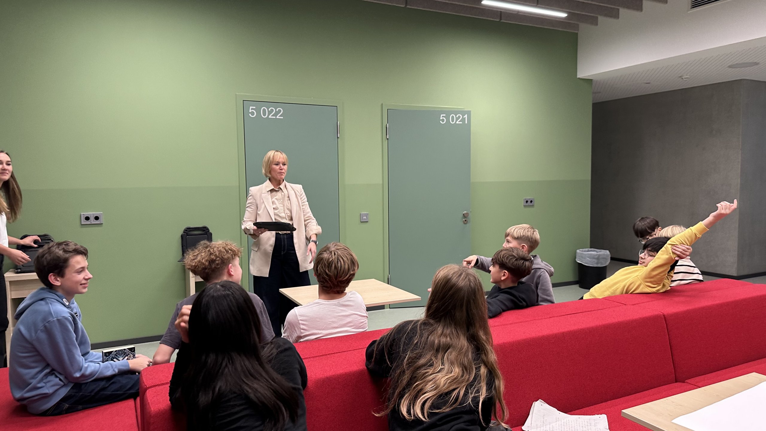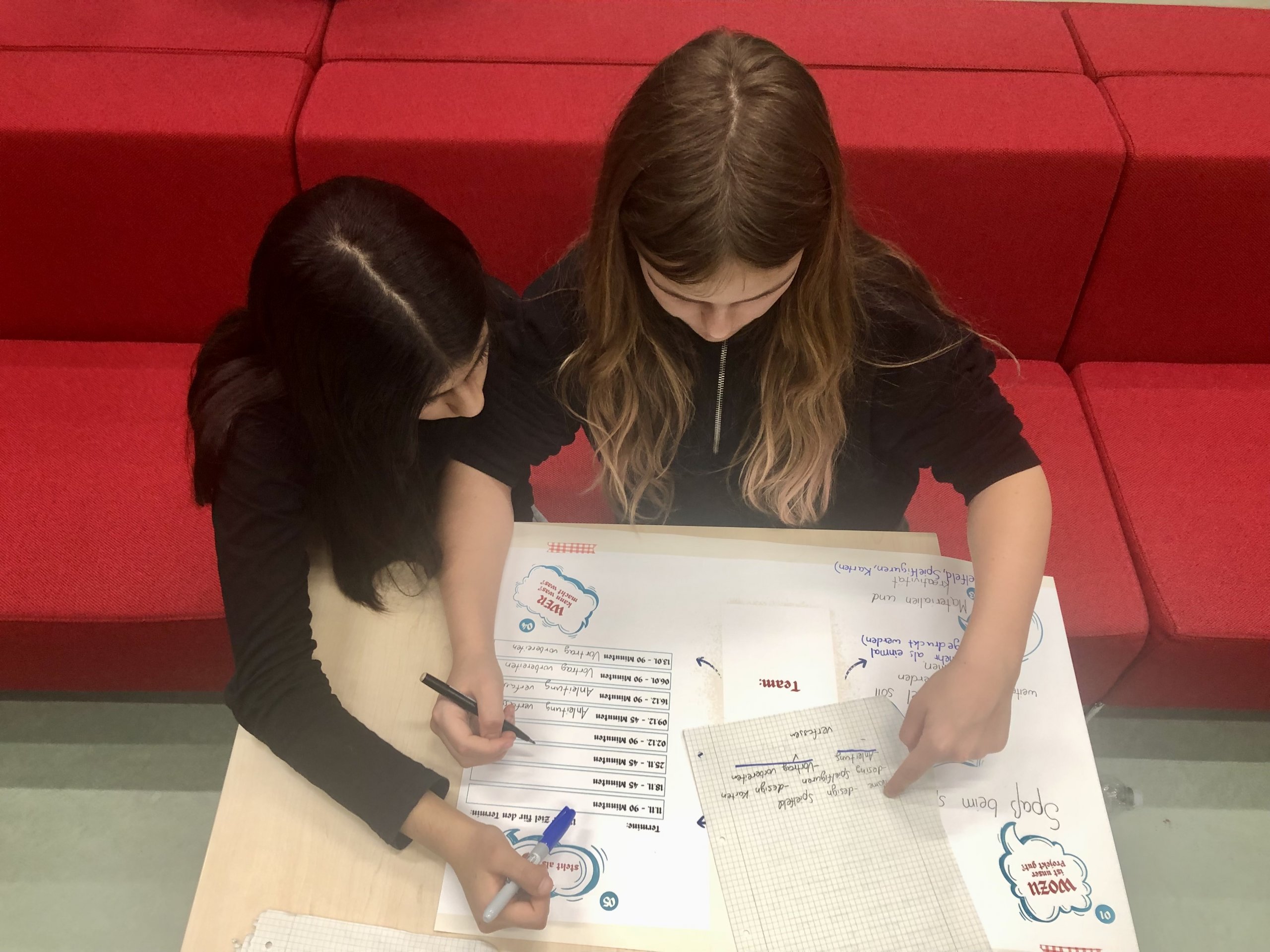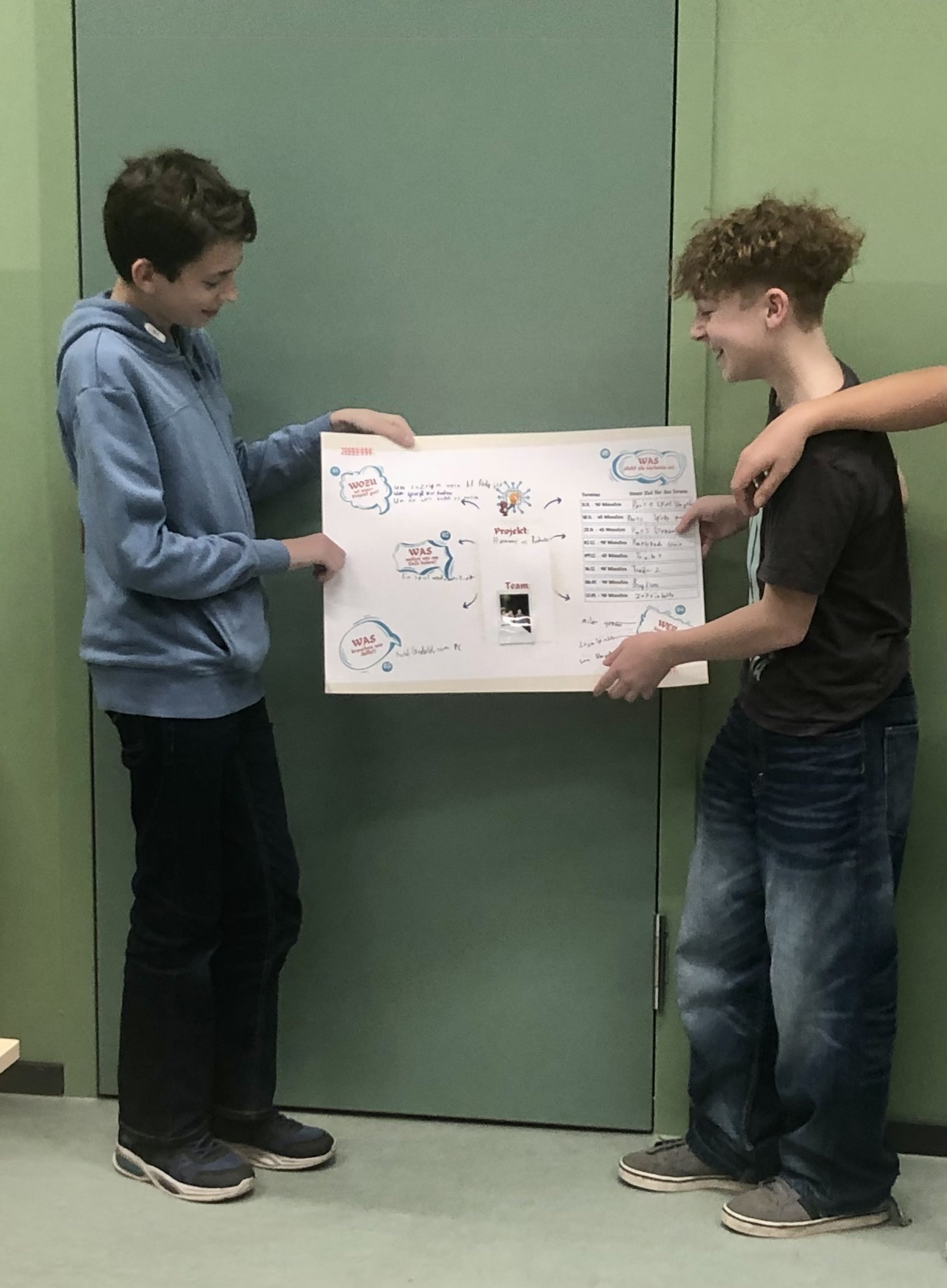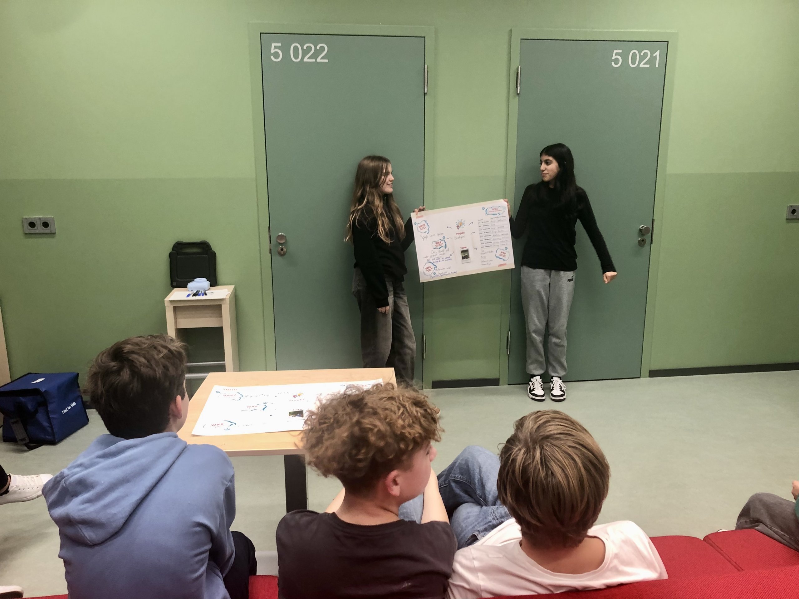 In der zweiten Stunde ging es nun um das WIE? Dafür haben die Jugendlichen aber tatkräftige Unterstützung erhalten. Karla und Andrea von St.Oberholz haben den AG-Teilnehmenden in der Stunde unter die Arme gegriffen um aus den „Was wollen wir machen?“ einen konkreten Projekt-Fahrplan für das „Wie wollen wir es schaffen?“ auf die Beine zu stellen. Als Expertinnen beraten Karla und Andrea Unternehmen wie sie gut in einem Team zusammenarbeiten (ob digital oder in Präsenz) um Projekte zu schaffen und gemeinsame Ziele zu erreichen. Auch helfen Sie Teams und Unternehmen dabei, Veränderungen zu gestalten und die Arbeitswelt von Morgen zu definieren.